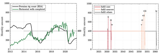 Historical number of completed wells and rig count from EIA and the future drilling programs in the Permian tight reservoirs at a constant drilling rate of 400 wells per month. The left panel shows the historical rig count from EIA, and the number of completed horizontal wells in the Permian Basin from Enverus. The roman numbers represent the last drilling date for each Permian region: (i) Delaware Bonespring Core, (ii) Midland Spraberry Core, (iii) Delaware Wolfcamp Core, (iv) Midland Wolfcamp Core, (v) Delaware Bonespring Noncore, (vi) Midland Spraberry Noncore, (vii) Delaware Wolfcamp Noncore, (viii) Midland Wolfcamp Noncore, and (ix) Others.