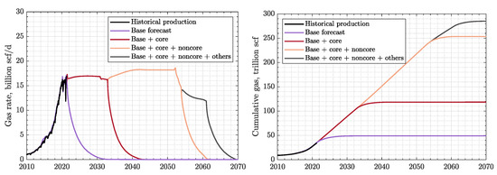 Using the same well prototypes in Figure 6 and GOR values in Table 3, we obtain the infill forecasts for oil production (Figure 15) and gas production (Figure 16). In Figure 15 (left), we show that by drilling new 55,402 horizontal wells in the core areas, we can maintain the production plateau of 4.6 million bbl/d for one more decade. Drilling additional 100,314 wells in the less productive noncore areas will drop the future oil rate plateau to 3.2 million bbl/d until 2053. Drilling 34,086 wells in the ‘Others’ area will not save the Permian Basin from terminal decline. The cumulative production in Figure 15 (right) shows the estimated ultimate recovery (EUR) for each infill scenario. Recall that the existing wells will ultimately produce 13 million bbl. By adding future drilling in the core, noncore, and ‘Others’ area, the oil EUR will increase to 32.2, 54.4, and 62.4 million bbl, respectively.