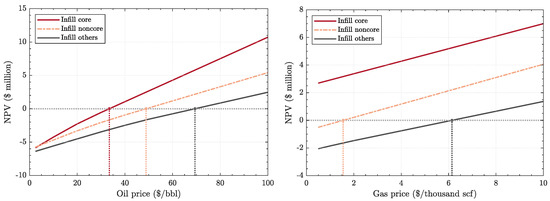 Figure 17 summarizes the results of our economic analyses for three different infill scenarios: Core, Noncore, and ‘Others’ in the Permian Basin. We plot the net present value (NPV) versus the prices. If NPV is positive, the project is profitable and vice versa. The intercept between each NPV line and the line is called the break-even point that indicates the oil/gas prices, below which an infill project becomes unprofitable. Figure 17 (left) shows a scenario where we assume a constant gas price of $4/kscf and vary the oil prices. We observe that infilling core areas is profitable even if the oil price is as low as $35/bbl. Infilling noncore areas is only profitable if the oil price exceeds $52/bbl. Operators should avoid infilling the ‘Others’ area, unless the oil price is above $72/bbl. The second scenario is shown in Figure 17 (right) where we assume a constant oil price of $60/bbl and vary gas prices. Using this scenario, infilling core areas will be profitable at any gas price. The break-even points for infilling the noncore and ‘Other’ areas are $1.5/kscf and $6/kscf.