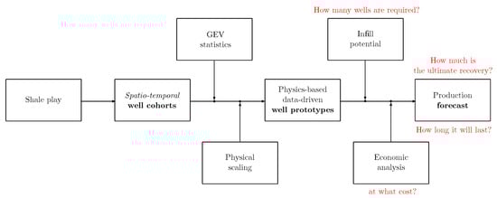 We have summarized how to obtain economic production forecasts from the major Permian tight formations in Figure 18. The methodology used in this paper is based substantially on our prior work on the physics-guided, data-driven forecasts in the Barnett [8], Eagle Ford [17], Bakken [9,18], Haynesville [10], and Marcellus [11]. Very briefly, our approach is as follows: