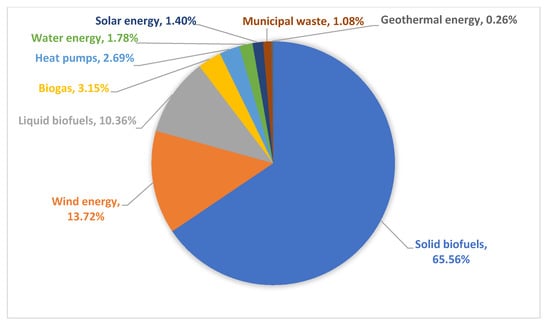 The total capacity of RES installations in Poland in 2010–2019 increased from 2556 MW in 2010 to 9106 MW in 2019, with the greatest extent coming from wind energy, biomass and biogas energy, water energy, and solar energy []. The structure of obtaining energy from renewable sources in 2019 was dominated by solid and liquid biofuels and wind energy (Figure 2). The share of energy from renewable sources in the gross final energy consumption was 12.18%, while the share of energy from renewable sources in the acquisition of primary energy in total increased in 2015–2019 from 13.25% to 15.96% [].