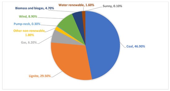 Both energy production in Poland and the maximum capacity are based mainly on fossil fuels—hard coal and lignite (Figure 3). Of the total energy mix in Poland, 84.79% comes from non-renewable sources and only 15.21% comes from renewable sources [].
