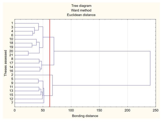 At the conceptualization stage, the issue of public participation in democratic processes in taking up social changes that took place in the second decade of the 21st century provoke reflection on the participation of society—especially young people—in making key decisions [,]. Taking into account the complexity of factors influencing the involvement of young people in shaping the socio-economic reality, a group of people aged between 18 and 40 was selected for the study. As the sample was randomly selected, the inference applies only to the studied group. In order to identify the respondents’ attitudes and their perception of the issues discussed in this study, a questionnaire was created containing a number of theses formulations assessed by the respondents in terms of compliance with their beliefs. The research tools were constructed in such a way as to provide data about the respondents, their environmental attitude, perception of anthropogenic impact on climate change (nine diagnostic theses), perception of renewable energy (seven diagnostic theses), and expectations regarding energy development in Poland and the role of government institutions (five diagnostic theses) in this process. Respondents were also asked about their preferences regarding the future use of available energy sources in Poland. It was also possible to identify basic demographic characteristics—gender, age, and place of residence. The assessment was performed using a five-point, bipolar Likert scale with a neutral value []. The values on the scale are marked as follows: 1 definitely not; 2—probably not; 3—neither yes nor no; 4—rather yes; 5—definitely yes. Statistical analyses of the collected material were performed using the Statistica program. First, cluster analysis was performed using the Ward method []. It is an exploratory data analysis, thanks to which it is possible to group responses to diagnostic theses into logically related sets [,]. This analysis allows for the agglomeration of objects in groups of subsets that are relatively homogeneous internally and relatively differentiated from one another []. Basic descriptive statistics were also calculated, the structure of the scores for diagnostic theses was analyzed, the mean scores and standard deviations were calculated, and the Pearson correlation analysis between the selected scores was calculated [].