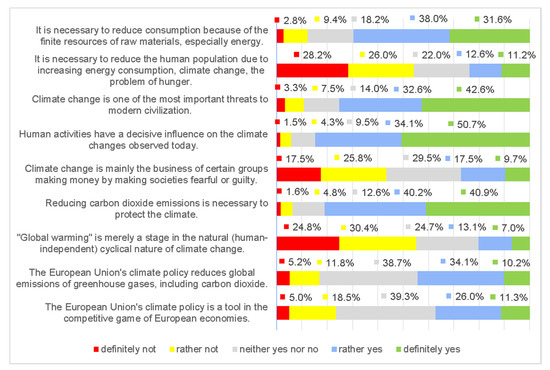 The perception of climate change has been studied by evaluating theses formulated in various ways. Some of the formulations on climate change presented the issue as one of the most important problems caused by people and possible to be limited by specific economic activities. The second part of the formulations presented climate change as a natural cyclical nature and the actions taken as an element of the competitive game of the largest economies and business groups (Figure 5). The conducted research shows that respondents perceive climate change as one of the main global problems (75.2% of responses) and recognize that human activity has a decisive influence on these changes (84.7% of responses). The thesis referring to the impact of human activity on the observed climate changes (Table 3) received the highest average score. It can therefore be concluded that the respondents are convinced about the importance of anthropogenic pressure in climate-creating processes.