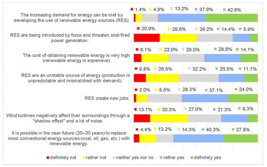 The formulated research theses contained both positive and negative attitudes towards renewable energy sources. In this part of the research, the highest average score was obtained by the thesis that “the growing demand for energy can be covered by developing the use of renewable energy sources” (Table 3). In this case, 80.5% of the respondents positively assessed this statement (Figure 6). Renewable energy was also attributed with another positive impact on the economy in the form of creating new jobs (61.2% of positive opinions). Among the statements assessed in this section, the lowest average was obtained by the thesis that “RES are introduced by force and threaten the coal-based energy sector”. Half of the respondents (50.6%) assessed this statement negatively. Based on the collected data, it can be concluded that the perception of renewable energy by the respondents is positive, full of hope that the energy needs of the developing economy will be met.
