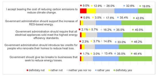 In the next part of the research, the respondents’ expectations regarding the directions of institutional support through the energy transformation and social acceptance of these changes were analyzed (Figure 7).