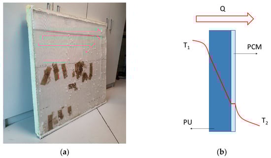 The proposed structure is based on a fragment of a conventional refrigerated trailer wall, made in the form of a sandwich panel made of two steel sheets, with 86 mm thick filling, made of polyurethane foam, with a thermal conductivity coefficient of λ = 0.025 Wm−1K−1. The macro-encapsulated phase change material was added to the inside of the wall. A structure made of cellular polycarbonate was used to contain the phase change material. The developed structure of the tested walls is presented in Figure 1a. Figure 1b shows the theoretical heat transfer through the proposed wall in the state when the phase change material remains frozen.