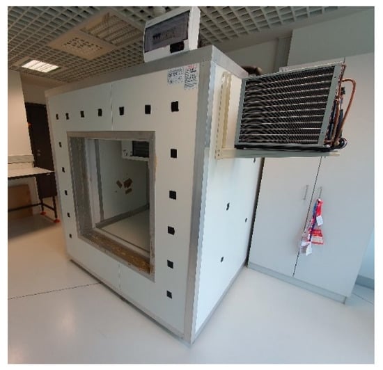 The tests of potential wall structures were carried out with the use of a specially designed climatic test chamber, which is presented in Figure 4. It consists of five adiabatic sandwich walls, each 40 cm thick, filled with mineral wool with a density of about 40 kg/m3 and thermal conductivity of λ = 0.035 Wm−1K−1. The thick layer of mineral wool is intended to ensure isothermal properties of the climatic test chamber’s interior. Inside the climatic test chamber, there is a space with a volume of about 1 m3, which can be cooled to −30 °C with the use of the integrated 0.8 kW refrigeration unit controlled by a thermostat. The climatic test chamber has no front wall, and the function of the front wall is performed by the tested wall. The climatic test chamber is placed on supports that distance it from the ground by 68 mm.