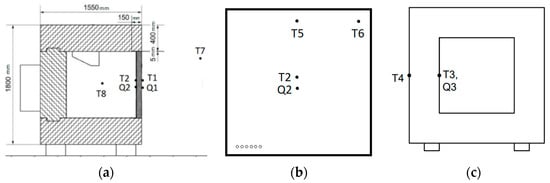 Location of the sensors during the tests: (a) cross-section view; (b) view from the inside of the tested wall; (c) front view.