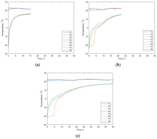 From the point of view of the purpose of the present research, the second phase of each of the experiments was more important, because the modernization of the wall structure was to keep the temperature inside the chamber low, and this was the focus of the analysis of the research results. Figure 6a–c present the temperature change curves at all eight measurement points, successively for the reference walls, the wall with a 6 mm PCM layer and the wall with a 10 mm PCM layer. The t0 time for the presented curves is the moment of switching off the refrigeration unit inside the chamber.
