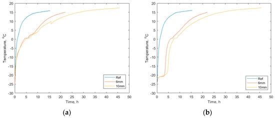 After a sufficient period of time, 24 h for the 6 mm layer and 40 h for the 10 mm layer, the refrigerating unit was turned off and the second test phase began, i.e., free heating of the climatic test chamber’s interior. The tests were terminated after the inside of the climatic test chamber reached the temperature of 15 °C—measured on T8.