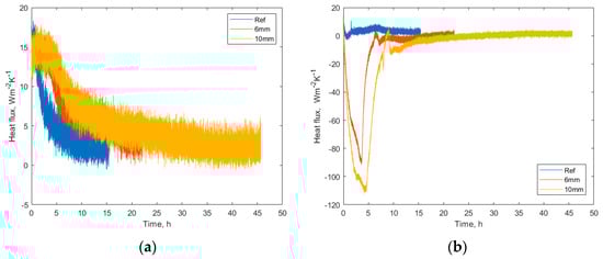 What is of particular interest in the case of heat flux measurements, at least when we consider the purpose of our research, are the readings of the Q2 sensor located on the inner surface of the tested walls. They show the direction and intensity of thermal energy emitted or absorbed by the layer of the phase change material. In an ideal case, i.e., when the temperature inside the chamber would remain below the phase transition temperature (there would be no heat penetration through other partitions), the Q2 sensor readings would oscillate around 0 Wm−2K−1, and the PCM would be heated only through heat penetrating from the outside, through the layer of polyurethane, the amount of which would be indicated by the Q1 sensor. The graphs of changes in the value of the heat flux at the Q1 and Q2 measurement points obtained during the experimental tests are presented as Figure 8a,b.
