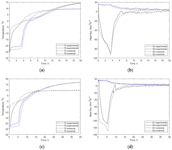 In this section, the results of experiments were compared with the results of numerical tests acquired by means of computer modeling in order to verify the correctness of these simulations. In particular, the data on the temperature inside the chamber at T2 and T8 measurement points and the heat flux at Q1 and Q2 measurement points were analyzed. The results of numerical modeling are presented in Figure 9a–d. The graphs of each of the measured parameters were compared with the plots of the corresponding values from the experiments.