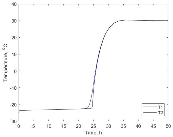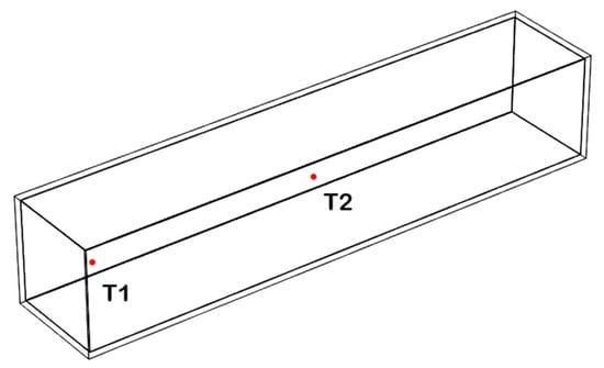At the stage of numerical testing, we tested the time of maintaining the required temperature inside the trailer. The measurement was made at two measurement points—T1 located 1 m from the front wall of the trailer and T2 located in the center of the trailer. Figure 11 presents the semi-trailer model with marked measurement points.