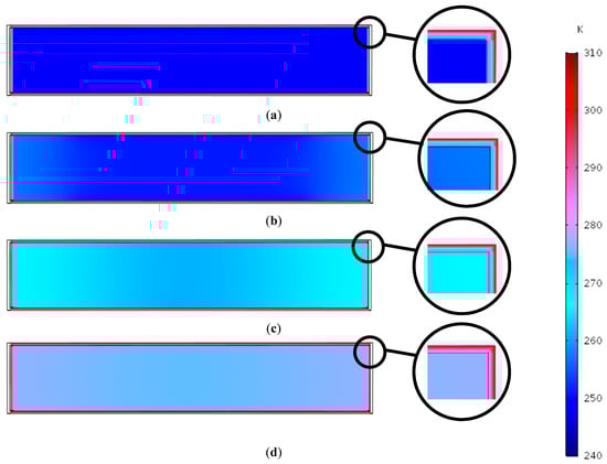 Distribution of temperature inside the refrigerated trailer over time (a) 0 h, (b) 24 h, (c) 25 h, and (d) 26 h.