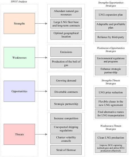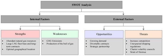 This section presents strengths, weaknesses, opportunities, and threats of the LNG supply chain in Qatar. The obtained internal and external factors of the analysis are demonstrated in Figure 2.