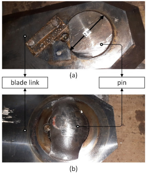 Figure 2 presents the blade link and the sheared pin front view (a) and back view (b), in which the pin failure is clear.