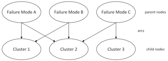 The fault diagnosis process starts with the construction of the BN graph based on the system information acquired in the first stage of the framework. Two types of nodes must form the graph of the BN: the parent nodes, which represent the failure modes, and the child nodes, which represent the clusters. As described earlier, the number of clusters is greater than or equal to the number of failure modes considered, causing the BN to have at least twice as many nodes as the number of failure modes under study. Each BN node will have two states, “true” and “false”. For nodes related to failure modes, the probabilities of these states indicate the probability of whether the failure has occurred or not. For nodes referring to clusters, on the other hand, these probabilities indicate the probability of detecting a variation in the monitored data. In the construction of the BN, it is also necessary to verify the relationship between the monitored variables, the failure modes, and the clusters. If the observation of a variable is influenced by a certain failure mode, the node related to this failure mode must be connected by an arc to each node that represents a cluster that contains the variable in question. Figure 4 presents an example of a graph of a BN. In this example, the behavior of variables in Cluster 1 is influenced by Failure Modes A and B, while variables in Cluster 3 indicate symptoms of Failure Mode C only. On the other hand, Cluster 2 variables are influenced by the three failure modes simultaneously.