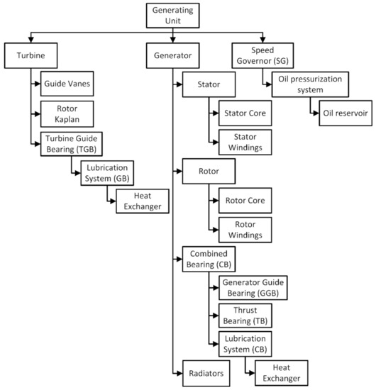 As previously presented, the first task of the FDD process built from the proposed framework is the definition of the system components that shall be analyzed. In this case, considering that the failure of the evaluated unit is associated with the SG and, as the functionality of this system is directly associated with the turbine and the generator, the three main systems selected were the turbine, the generator, and the SG. Another determining factor for establishing the subsystems and components considered in the analysis was the availability of monitored data. Since it is not possible to carry out the FDD process of subsystems and components without their monitoring data, only monitored equipment can be analyzed.