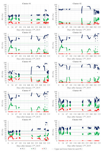 The values for PC1, PC2, and PC3 over time were obtained between 17 January 2019 (due to the reference window needed to assess the normal condition of each cluster within the defined power output) and 19 December 2019 (the last date on which the unit operated in the defined operating condition before breakdown). Figure 6 shows the results of each considered cluster, with the percentage weight of each main component concerning the total variability of the analyzed data being presented on the ordinate axis and with the time elapsed (in days) after 17 January 2019 on the abscissa axis.