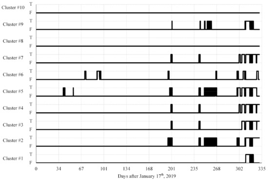 Thus, Figure 7 shows the compiled results of the detection process for all analyzed clusters. Once again, the abscissa axis presents the number of days from 17 January 2019. It is interesting to note that anomalies were detected in all clusters, except for clusters #8 and #10.