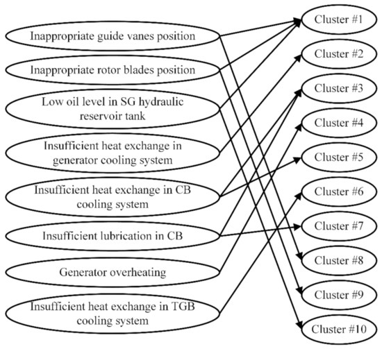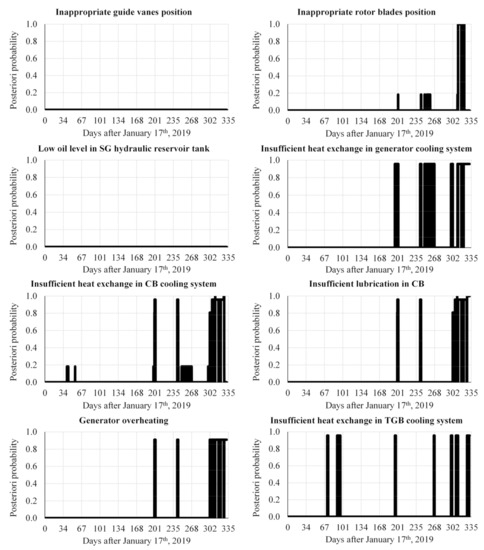 The results of the diagnosis process over time, considering the responses of each cluster shown in Figure 7, applied in turn to the BN shown in Figure 8, considering the a priori probability (presented in Table 2) of each failure mode, are shown in Figure 9. As in Figure 6 and Figure 7, the abscissa axis of the graphs shown in Figure 9 represents the number of days elapsed after 17 January 2019. Analyzing the results of the diagnosis process, it is noticed that 6 of the 8 failure modes considered were diagnosed at some point. The exceptions are failure modes “Inappropriate guide vanes position” and “Low oil level in SG hydraulic reservoir tank”. Furthermore, between November and December 2019, the detection of anomalies became more present, leading to a more evident diagnosis (greater posterior probability) of the failure modes found. Furthermore, note that the diagnosis of failure modes “Insufficient heat exchange in generator cooling system” and “Generator overheating” are strongly correlated, as well as that of failure modes “Insufficient heat exchange in CB cooling system” and “Insufficient lubrication in CB”.
