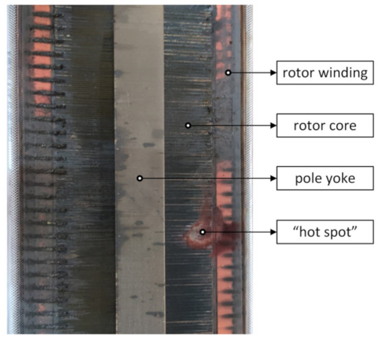 Regarding the diagnosis results related to the generator system (“Insufficient heat exchange in generator cooling system” and “Generator overheating”), it is noted that some factors would be leading to the generator overheating. A fault in the cooling system, as indicated in the results, could be the cause, bringing as a possible consequence the loss of efficiency of the copper insulation and the generation of hot spots due to an electrical failure. It is worth noting that, despite the evidence presented by the detection and diagnosis method for these failure modes, the unit’s SCADA system did not indicate any alarm related to possible issues of this nature. Likewise, when the analyzes presented in this work were in their initial phase, no information about possible failures in the generator was available, even leading the authors to question the results obtained. However, when the unit was disassembled due to the SG failure, evidence of a localized short circuit in the rotor was found, thus confirming the diagnosis generated by the applied FDD method, as presented in Figure 10.