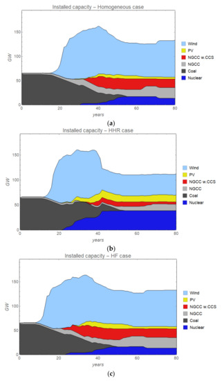 Installed capacity in the (a) homogeneous case, (b) HHR case, and (c) HF case. In all three cases, the capacity mix goes from coal-based to low-carbon, but the transition speed and final mix vary.