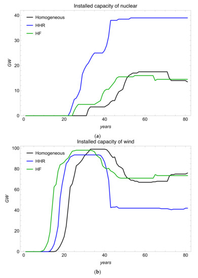 Installed capacity by technology in homogeneous, HHR, and HF cases. (a) Nuclear, (b) wind. In the HHR case, there is significantly more nuclear and less wind. The earliest wind expansion is observed in the HF case.