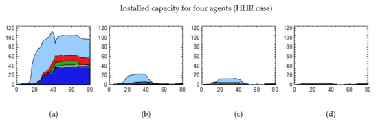 When looking at the HHR case from the agent’s investment perspective, we see that while the agent with the lowest hurdle rates (5%/year) dominates investing, agents with hurdle rates over 6.75%/year do not make any investments at all (see Figure 3a–d). This is because agents with lower hurdle rates are more willing to invest than other agents, as they have a lower requirement on future net revenues, which in turn lowers the electricity price. This reduces returns on investment so much that agents requiring a higher return never invest and are largely outcompeted.