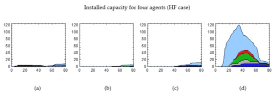 Illustration of the installed capacity for some agents in HF case. (a) β = 0.0, (b) β = 1.0, (c) β = 1.2, (d) β = 1.5. (β is the multiplication factor of expectation of CO2 tax). The agent with β = 1.5 dominates the investing in the first 50 years; afterwards, all agents contribute to investing in new capacities.