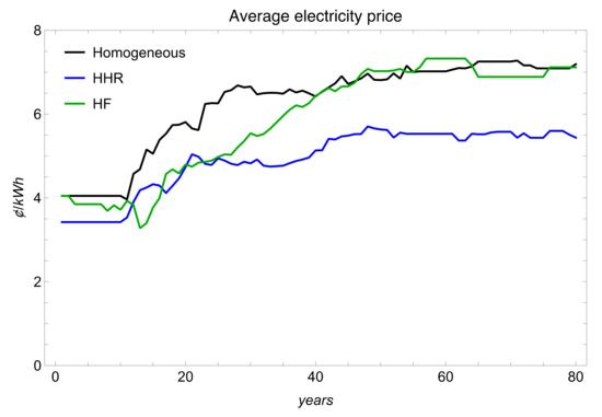 Average electricity prices for the homogeneous case, HHR case, and HF case.