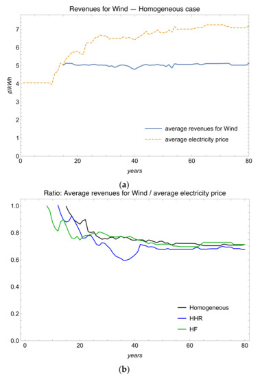 Second, the lower hurdle rate makes the cost of nuclear drop more than for its dispatchable competitors—NGCC—and natural gas with CCS, and therefore nuclear takes market shares from these technologies. Now, since wind and gas-fired power plants tend to be more complementary to, than competitive with, each other [12,33], the installed wind capacity actually drops as a consequence of the decline of gas-fired power plants (both NGCC and natural gas with CCS). Therefore, towards the end of the period, there is significantly more nuclear and less wind in the HHR case than in the homogeneous case. (We conducted a sensitivity analysis of the impact of the hurdle rate on the installed capacity of wind and how it is related to the availability of gas-fired power plants. See Supplementary Materials for details).