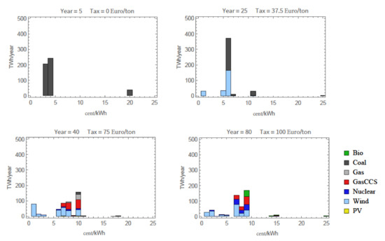 Figure 7 shows the amount of electricity produced at different prices for the homogeneous case. In year 5, while coal still dominates production, we see that most electricity is produced and sold at 3–4 EUR ct/kWh, but there is also some electricity produced at around 20 EUR ct/kWh, associated with ~500 h of the highest reference demand. In year 25, most electricity produced, from both wind and coal, is sold at 5–6 EUR ct/kWh. Meanwhile, the high wind capacity can result in very low prices, ~1 EUR ct/kWh, as well as very high prices, 25 EUR ct/kWh or above, for some hours of the year (a similar observation has been made by Auer and Hass [43]). When agents have invested heavily in wind, there is less incentive to invest in other technologies (because prices have been depressed), and when demand is high and wind output is low during certain hours of the year, prices may become very high. By year 40, the expansion of wind has led to a situation with many hours having a price level of less than 1 EUR ct/kWh. However, the high price spikes are damped by the increased presence of biogas, natural gas with CCS, and nuclear power (see Figure 7 for year 80). The price variation is also presented by the 10th and 90th percentiles in the Supplementary Materials, see Figure S6a–c.