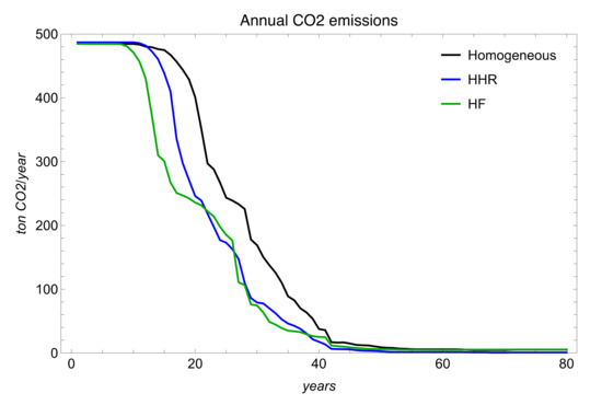 Annual CO2 emissions trajectory for the homogeneous case, HHR case, and HF case.