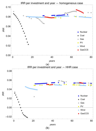In the HHR case, IRRs of most investments are around 5%/year, which is the hurdle rate applied by the agent that made almost all the investments. The IRR of coal is even lower in this case, due to a lower electricity price.