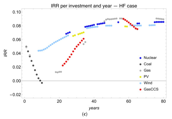 Internal rate of return (IRR) of investments in the (a) homogeneous case, (b) HHR case, and (c) HF case. Except for coal, the IRRs are mainly close to the level of the hurdle rates used by agents who make the investments.