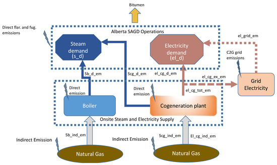 For electricity direct and indirect emissions, the displacement allocation method was used to calculate the amount of natural gas used to generate electricity [30]. In the case of cogeneration, the SGER provides credits for facilities that cogenerate a surplus amount of electricity that is exported to the grid. One case in our calculations was considered using the electricity emissions factor for cogeneration compliance adjustment as per the Government of Alberta [31]. Calculation details are described in the Supplementary Material.