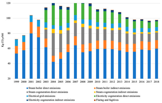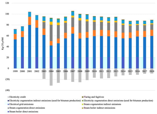 For electricity credit, the electricity credit of SAGD using the electricity displacement factors set up by the Government of Alberta for offset projects that result in a decrease of grid electricity usage was calculated [12,33,34]. This change increased the amount of electricity credit provided for facilities that cogenerate a surplus amount of electricity that is exported to the grid. This reduced the emission intensity for SAGD (44.5 to 104 kgCO2e/bbl). However, the reduction of the credit over time is the same at ~63% from 2007 to 2018, which offsets reductions of natural gas combustion emissions.