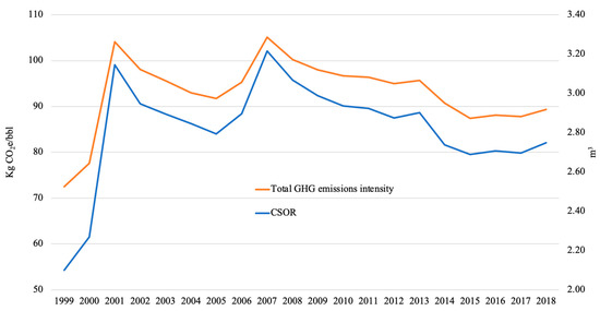 Figure 5 presents the GHG emissions intensity of the SAGD operations by year (from 1999 to 2018) and cumulative steam-to-oil ratio (cSOR, steam expressed as cold-water equivalent) from Case 1. As shown in previous studies (e.g., Gates and Larter [11]), there is a direct relationship between cSOR and GHG emission intensity: the larger the cSOR, the greater the GHG emissions intensity. For all operations, the cSOR ranges from 2.10 to 3.21 m3/m3 reaching its peak in 2007, with an emissions intensity of 105.07 kgCO2e/bbl. This increase of cSOR and emission intensity in 2007 was caused by the start-up of new SAGD projects where steam was injected with relatively low oil produced, which occurs during the SAGD circulation phase. After circulation, the cSOR drops since greater volumes of oil are produced from the reservoir. In Case 1, the emission intensity from 2007 to 2018 dropped by 15% (105.07 kgCO2e/bbl in 2007 to 89.38 kgCO2e/bbl in 2018) and 15% in cSOR (3.21 in 2007 to 2.75 in 2018). The results are the same in terms of direct relationship between cSOR and emissions intensity in Cases 2 and 3.