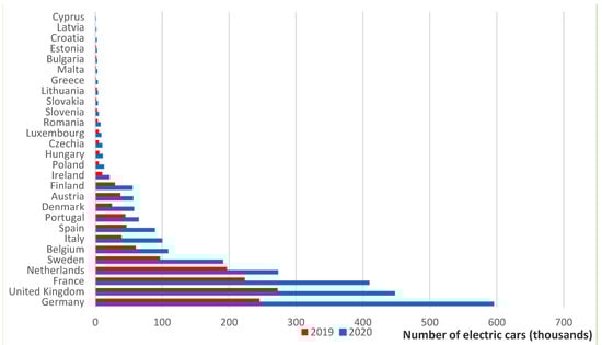 Number of electric cars in EU countries in 2019 and 2020.