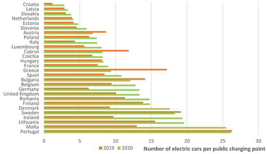 Appropriate infrastructure in the form of public charging stations contributes to the development of electromobility. Such points are located in the largest cities. The situation in this respect is improving year by year. Individual countries were compared in terms of infrastructure using the indicator of the number of electric cars per one public charging point (Figure 3). It turns out that the largest number of cars for such a point was in countries with a relatively small number of vehicles, such as Portugal, Malta and Lithuania. Probably in this case the development of infrastructure did not keep up with the increase in sales of this type of cars. The case of Germany is interesting, where in 2019 there were 6.2 electric cars per public charging point, and in 2020 it was already 13.3. The reason for such a large increase in the indicator was the very high sales of electric cars in 2020 (an increase of 143% compared with 2019), with a small increase in public charging points (by 14%). A similar situation also occurred in the case of Malta, Ireland, Denmark and Luxembourg. Only a few countries have seen a lower load on public charging stations, i.e., Greece, Cyprus, Bulgaria and Austria. This was due to large investments in infrastructure. In most EU countries, the changes were not large. Of course, the COVID-19 pandemic could have had an impact on electromobility development strategies in individual countries. This problem requires closer examination. The presented results show that there has been no single path for the development of electromobility in individual EU countries.