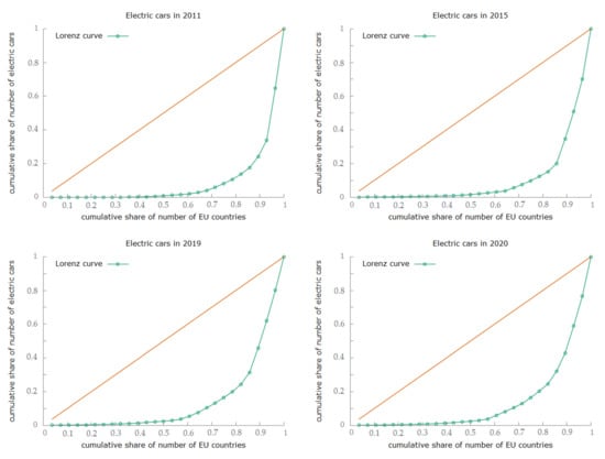 Lorenz concentration curves for number of electric cars in the EU countries in 2011–2020.