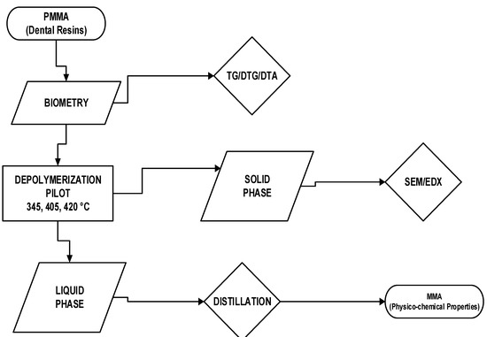 The applied methodology is synthesized by the diagram illustrated in Figure 1. The methodology is outlined as a rational sequence of concepts/ideas, methods, and process to obtain methyl methacrylate (MMA) by fractional distillation of liquid phase reaction products obtained by depolymerization of PMMA based dental resins fragments/residues at 345, 405, and 420 °C, atmosphere pressure, in pilot scale. Initially, the mass, longitudinal and transversal diameter of PMMA-based dental resins scraps were determined (biometry). Afterward, thermal gravimetric analysis of PMMA-based dental resin scraps was carried out to guide the experiments in pilot scale. The thermal degradation experiments carry out to study the influence of temperature and reaction time on the yield of liquid phase and the concentration of MMA within the liquid phase products. The liquid phase reaction products were submitted to fractional distillation to produce MMA with high purity. The composition and physicochemical properties of distillation fractions were determined experimentally. The solid phase was characterized by TG/DTG/DTA, SEM and EDX.