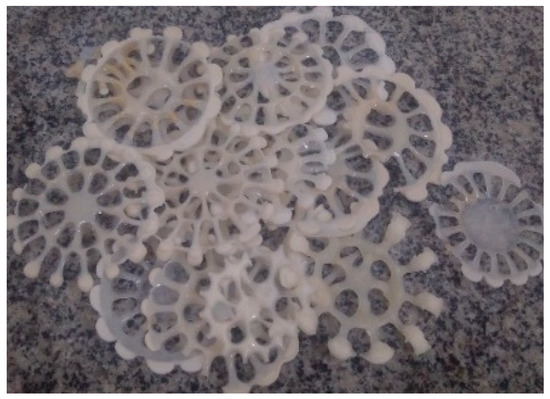 Dentsply Indústria e Comércio Ltd.a (Petrópolis, RJ-Brazil) supplied the PMMA based dental resin residues, as shown in Figure 2. The formulation of dental resins produced by polymerization of MMA includes 1.0% (wt.) of TiO2 and 5.0% (wt.) of ethylene glycol dimethacrylate (EGDMA) [17].
