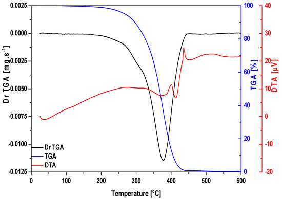 The thermogravimetric analysis was performed by using a thermal analyzer (Shimadzu, Kyoto, Japan, Model: DTG 60-H), and the following conditions were used: The sample mass (5.575 mg) placed inside the microbalance, temperature range between 25–600 °C, heat rate of 10 °C/min, and 50 mL/min of N2.