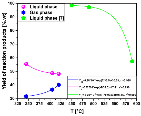 The experiments show liquid phase yields between 48.20 and 55.50% (wt.), solid (coke) phase yields between 11.67 and 14.67% (wt.), and gas yields between 31.69 and 40.13% (wt.). The yield of liquid phase decline with temperature, showing a first order exponential decay behavior, whereas that of gas phase shows a first order exponential growth. The same exponential decay behavior for the liquid phase was observed by plotting the liquid phase yields reported by Kaminsky and Frank [7], as shown in Figure 5. The yields of liquid phase by depolymerization of PMMA [7,8,11,13,34], filled PMMA [8,11,16,35], and waste PMMA [6,7,13,17,34] to recover MMA is shown in Table 3. The yields of liquid phase (Table 2) are higher than those reported elsewhere [8,11,34], smaller than those reported in the literature [6,7,13,16,17,34], showing percent errors between 14.61 and 16.29% compared to the results reported by Szabo et al. [16], and Braido et al. [17], respectively, who used a fixed bed reactor type. In fact, depolymerization fluidized bed reactors operating in continuous mode are known to maximize the liquid phase yields [6,7]. Besides, smaller particle sizes () were used as feed [7,13], conferring a higher heat transmission rate, particularly in fluidized bed reactor mode of operation. By the fact PMMA has a low thermal conductivity [6], the larger the mean particle size (), worse the heat transfer rate, and the lower the conversion of PMMA into MMA.