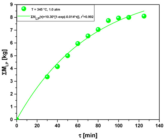 The cumulative yield of reaction liquid products, illustrated in Figure 7, correlated with a first order exponential, named BoxLucas1, exhibits root-mean-square error (r2) of 0.990. The parameters YLP(0) and in the BoxLucas1 equation ∑YLP(τ) = YLP(0) × [1 − exp(− × τ)] are associated with the cumulative yield of liquid products ∑YLP(τ→∝) for τ→∝, the asymptotic value of ∑YLP(τ), equal to 71.92 [wt.%], and the reaction rate constant of depolymerization kinetic, equal to 0.0135 min−1. Since the yield of reaction liquid products is defined as YLP = MLP/MPMMA, differentiation of YLP gives , showing the yield of reaction liquid products obeys a first order kinetics.