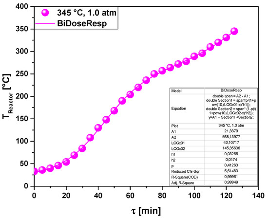 The course of reactor temperature, shown in Figure 8, by depolymerization of PMMA based dental resins fragments/residues at 345 °C, atmospheric pressure, in pilot scale, was correlated with a BiDoseResp function, exhibiting root-mean-square error (r2) of 0.999. By BiDoseResp function, A1 and A2 are the bottom (initial value) and top (final value) asymptotes, respectively, being A1 equal to 21.34 °C and A2 equal to 568.14 °C. In addition, h1 and h2 are the slopes (tangents) of part 1 and part 2 of BiDoseResp function, being h1 equal to 0.03255 and h2 equal to 0.0174, showing that , that is, the reactor temperature increases more rapidly in part 1 (beginning) compared to part 2 (end) of depolymerization reaction.