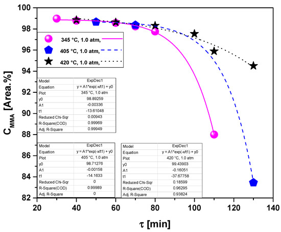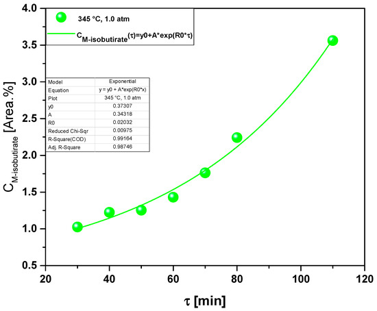The concentration of methyl iso-butyrate grows with time, being correlated with a were correlated with a first order exponential growth function CM-iso-butyrate(τ) = A1 × exp(−τ/KM-iso-butyrate) + CM-iso-butyrate(30), 30 min ≤ τ ≤ 130 min, exhibiting root-mean-square error (r2) of 0.992. The parameters CM-iso-butyrate(30) is associated with the concentration of methyl iso-butyrate CM-iso-butyrate(τ = 30 min), equal to 98.89 at 345 °C, 98.71 at 405 °C, and 99.44% [area.] at 420 °C, while KM-iso-butyrate is associated to the rate constant of M-iso-butyrate formation, equal to −13.61 min−1 at 345 °C, −14.16 min−1 at 405 °C, and −37.69 min−1 at 420 °C.